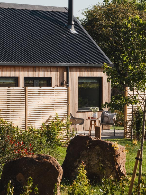 Interpretation extends beyond architecture into the landscape. The grounds are deliberately informal, with wildflower meadows, native trees, and an orchard creating a relaxed, biodiverse setting. Meandering paths connect the units to a communal area - a contemplative space that invites guests to engage with the site’s story, enriching the visitor experience.