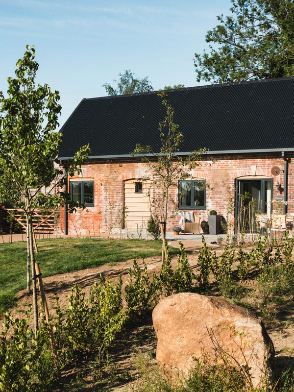 The architecture draws deeply from the farm’s evolution. Historic maps and photographs informed a design that acknowledges the original courtyard form and agricultural character. Two barns are created within the oldest surviving building, its brick and Sarson stone walls retained and enhanced with a reinstated pitched roof, echoing its past life as a stable. Four new single-storey barns complement this heritage, their contemporary forms inspired by traditional farm structures. Varied roof pitches and a palette of timber, stone, and profiled steel reference the site’s DNA, ensuring the buildings feel rooted yet unmistakably of their time.